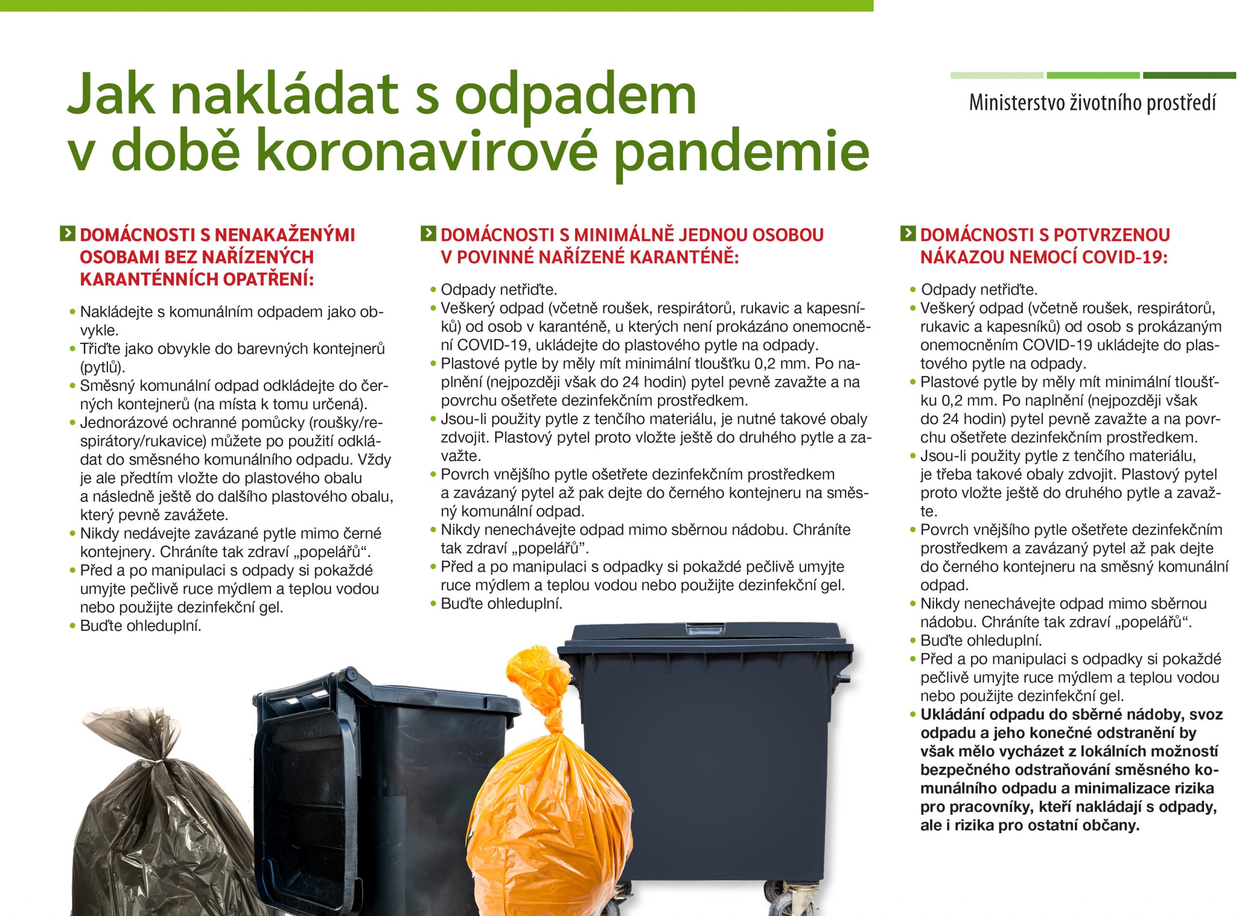 Ministerstvo životního prostředí radí domácnostem s výskytem onemocnění covid-19 nebo v nařízené karanténě netřídit odpad. Odpadky vyhazujte do směsného odpadu a berte zřetel, aby nedošlo k žádnému kontaktu s vyhozeným obsahem, kterého se nakažený dotýkal. Používejte ochranné rukavice.