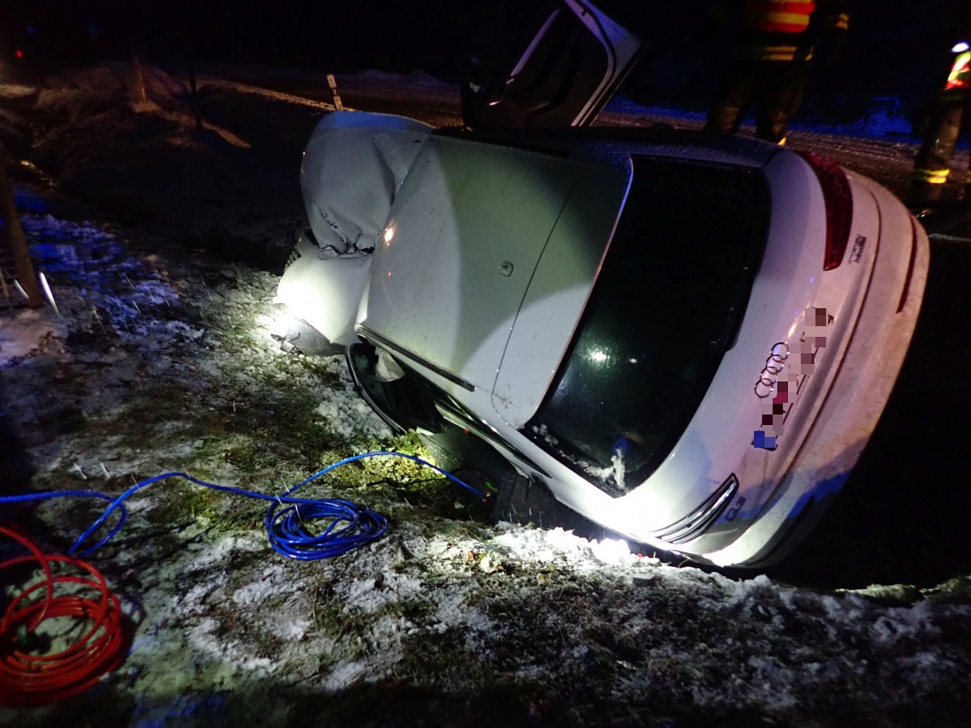 U Velkých Karlovic zasahovali hasiči u nehody osobního vozidla, bylo v příkopu na boku