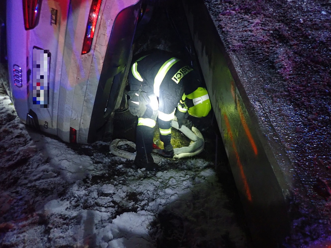 Po příjezdu hasiči průzkumem zjistili, že vozidlo se nachází v příkopu a leží na boku. Ve vozidle se před nehodou nacházely 2 osoby. Jednu z nich museli hasiči vyprostit pomocí pneumatických zvedacích vaků. Obě osoby byly při nehodě zraněny, a proto si je do péče převzala zdravotnická záchranná služba a odvezla je do nemocnice k dalšímu ošetření.