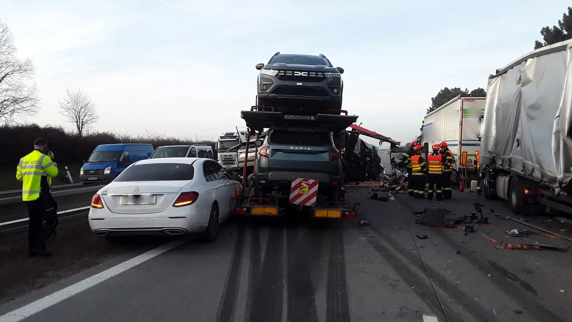 Hromadná nehoda na D2: Kamion převážející Dacie se srazil s dalšími vozidly