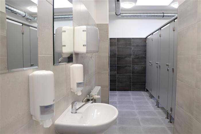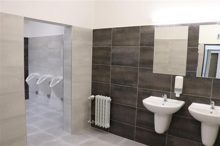 Proměna se odehrála i v prostoru sociálního zařízení. Došlo k výměně rozvodů vody, elektroinstalace, obkladů i svítidel. Přibyla speciální toaleta pro osoby se ztíženou schopností pohybu. Všechny staré dveře v přísálí, na toaletách i v propojujícím vestibulu nahradily nové s protipožární odolností.