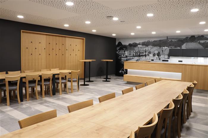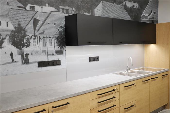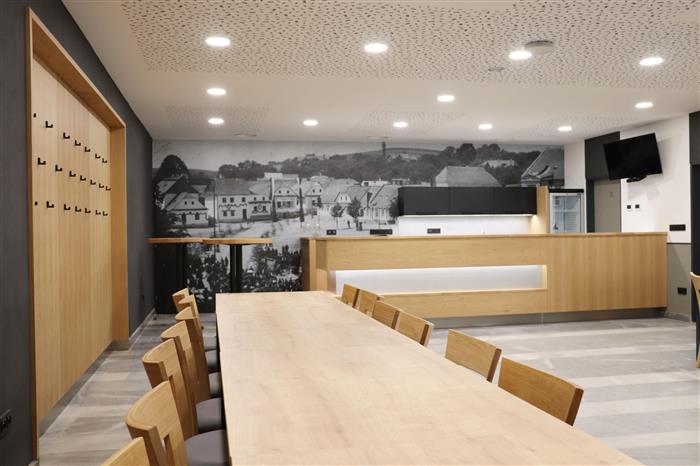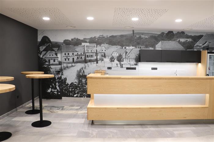 „Kuchyňský kout nabídne nové vybavení i osvětlený barový a pracovní pult. V pozadí kuchyňky zdobí stěnu velkoplošná fototapeta, která na historické fotografii připomíná původní zástavbu Masarykova náměstí, konkrétně místa, kde stojí dnešní kulturní dům,“ přiblížil Jaroslav Baloušek, ředitel Kulturního a vzdělávacího střediska Valašské Klobouky. Vkusnou dekoraci, podobně jako pojetí celého interiéru, navrhl architekt Marek Zámečník.