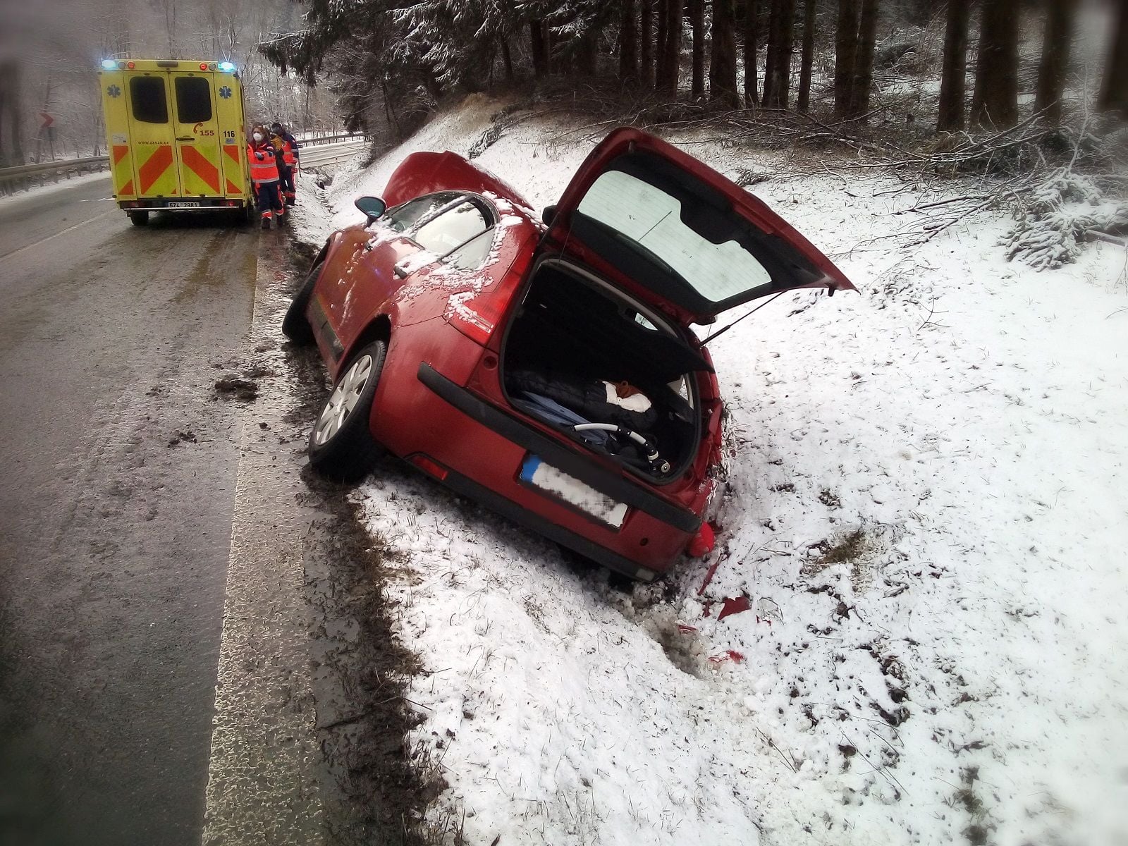 Ledovka na silnicích: Nehoda auta v Brumově-Bylnici
