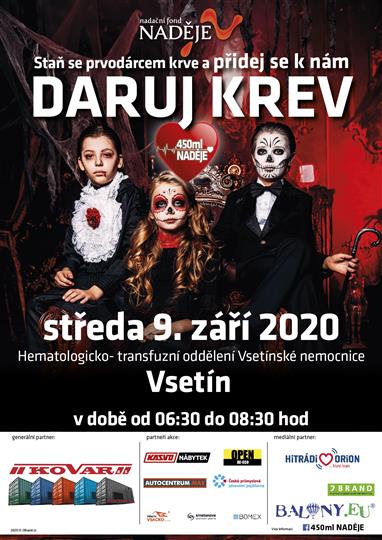 Ve středu 9. září se v prostorách hematologicko-transfúzního oddělení Vsetínské nemocnice uskuteční akce na nábor nových dárců krve i podporu těch stávajících. Zájemce o dárcovství zve Nadační fond Naděje v rámci projektu „450 ml naděje“.
