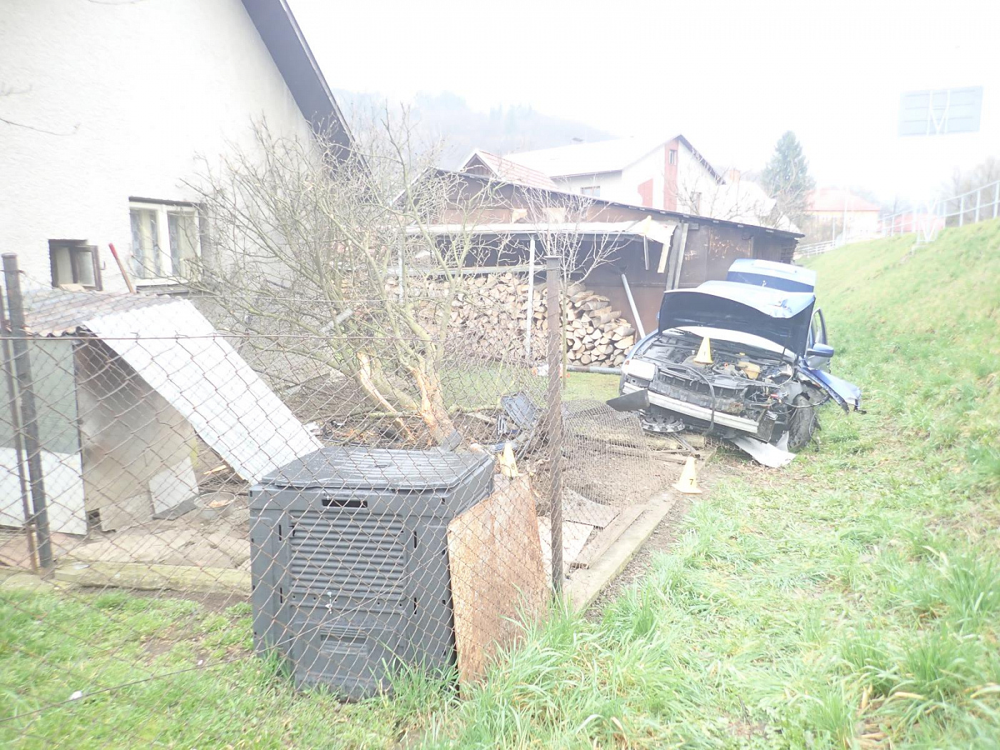 Řidič osobního vozidla, jedoucí spolu s dalšími třemi spolucestujícími, sjel na kruhovém objezdu mimo cestu přes zábradlí do zahrady rodinného domu, kde porazil plot, zlomil strom a zbořil kurník.