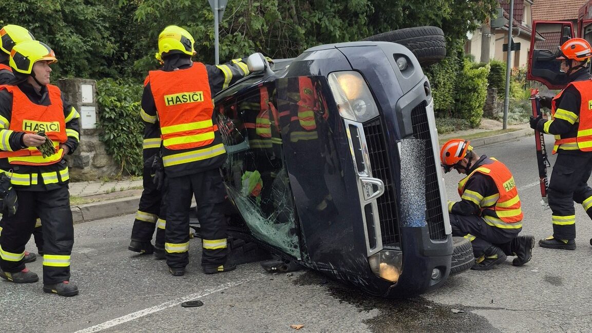 Nehoda v Zádveřicích: auto skončilo na boku, dva lidé se zranili