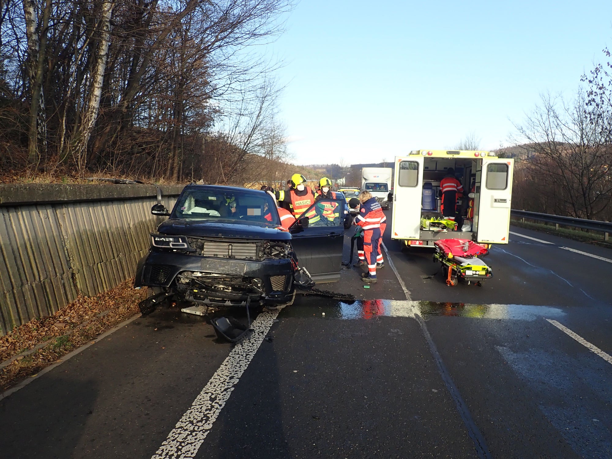 Provoz na této silnici tak byl na několik hodin omezen a sveden do jednoho jízdního pruhu. Při nárazu byl řidič zraněn. Po příjezdu na místo hasiči muži, který ve vozidle cestoval sám, poskytli předlékařskou pomoc včetně nasazení krčního límce.