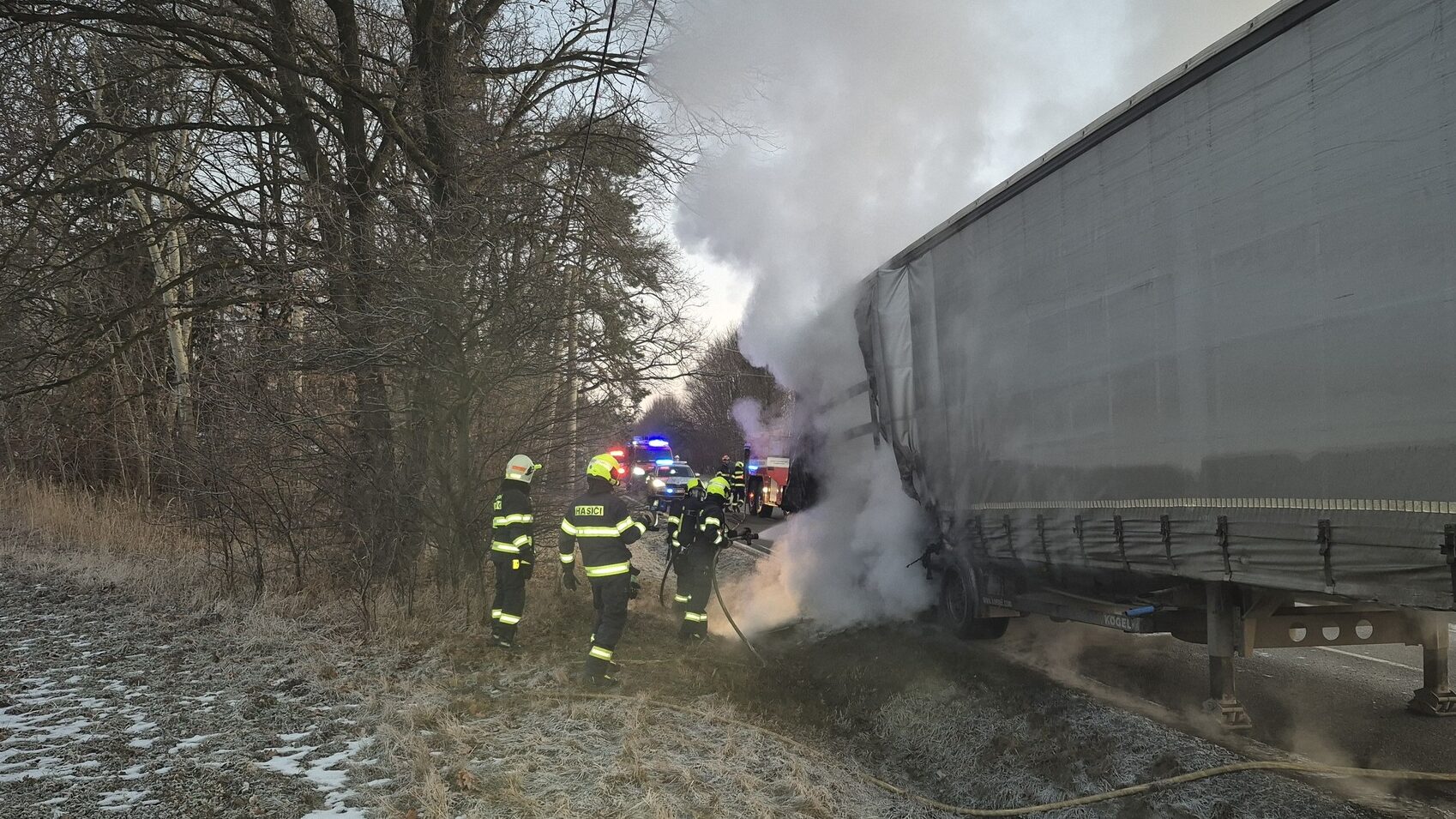 Ranní dopravu na silnici ve směru od Krhové na Nový Jičín zkomplikoval požár nákladního automobilu, ke kterému došlo krátce po sedmé hodině. Řidič si během jízdy všiml technického problému a záhy se ukázalo, že přívěs vozidla zachvátily plameny.