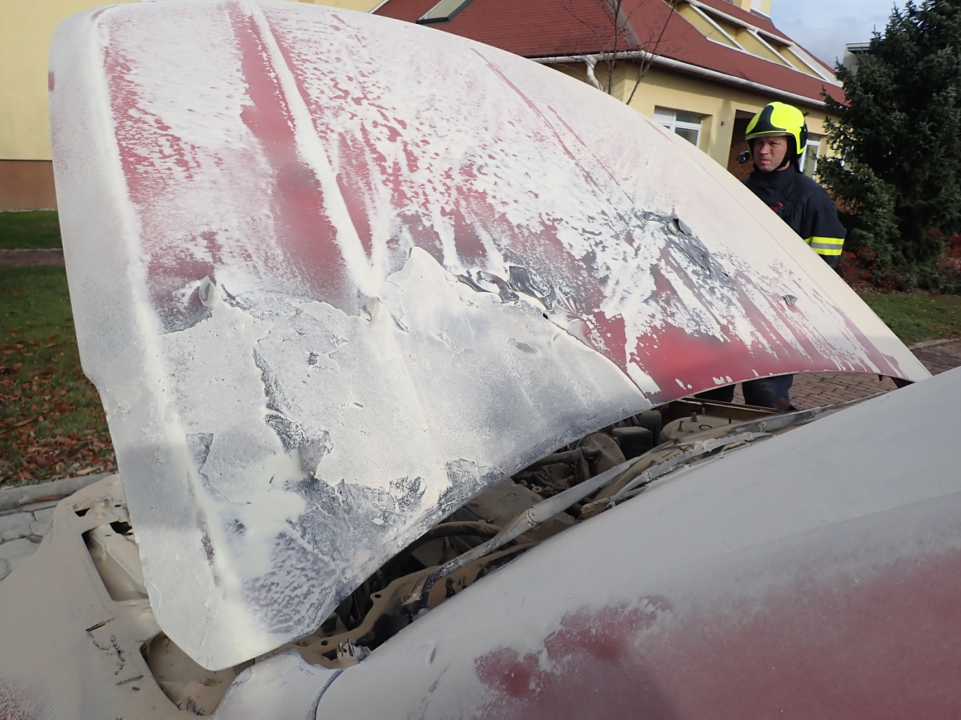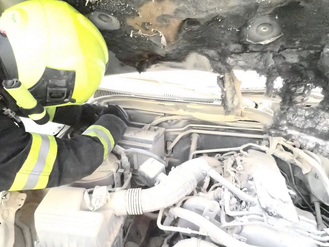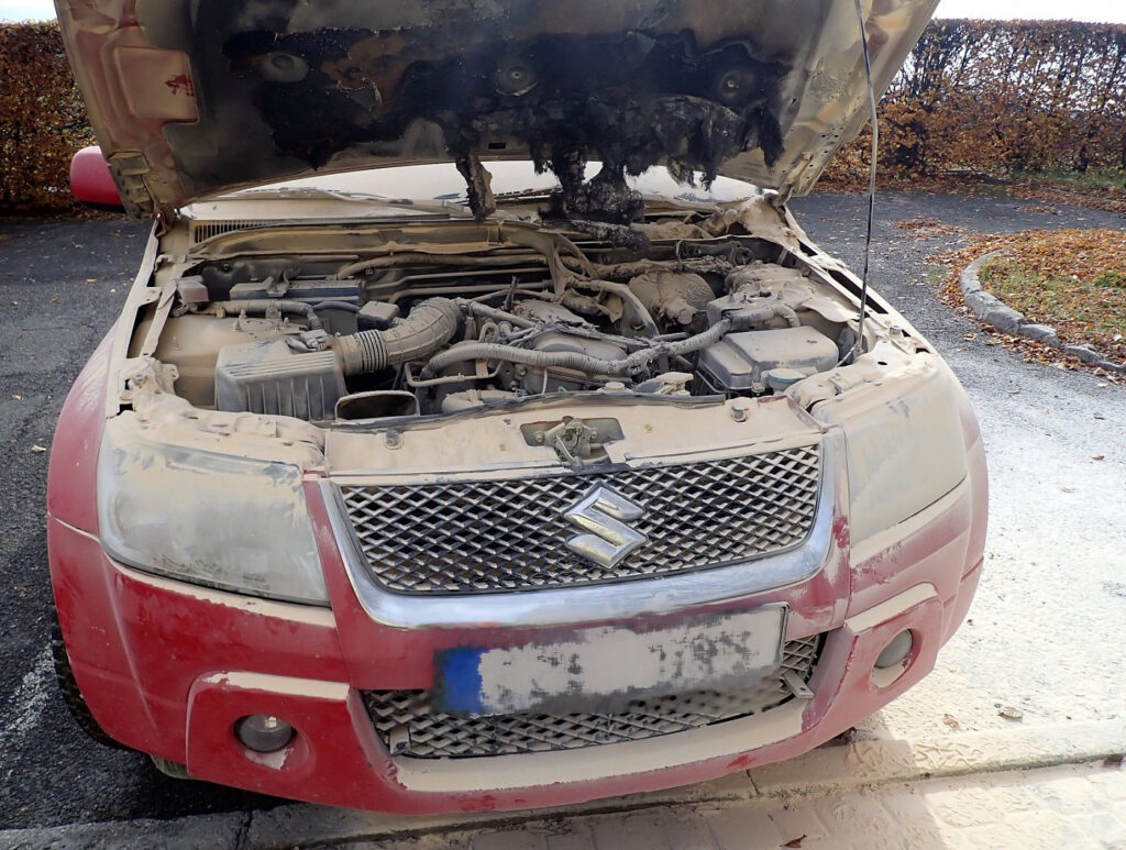 V době našeho příjezdu byl požár uhašen šesti hasicími přístroji a automobily, které stály u hořícího auta, už byly přeparkovány. Provedli jsme proto odpojení akumulátoru a termokamerou překontrolovali teploty. Požár se nerozšířil do kabiny vozu. K zranění osob nedošlo.