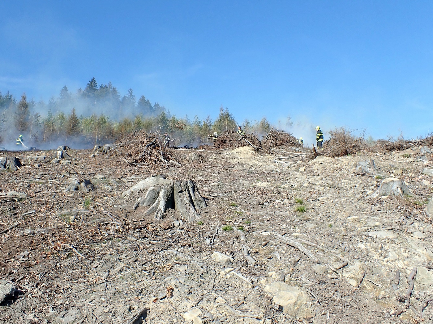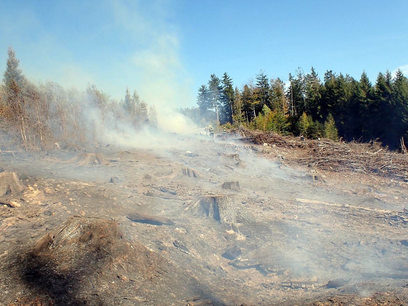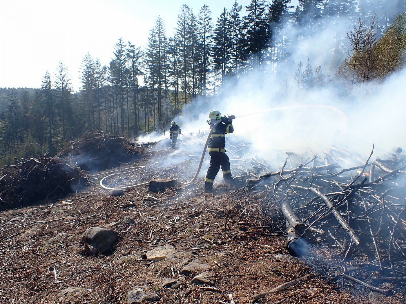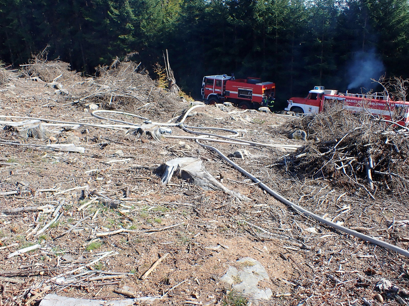 Požár vznikl v těžkém lesním terénu, kam se nedostaly všechny cisterny. Některé tak zůstaly na seřadišti a pomocí hadicového vedení byla na místo dopravována hasební voda. Několika útočnými proudy a jednoduchými hasebními prostředky byl požár asi po dvou hodinách zásahu lokalizován. Celková likvidace byla velitelem ohlášena v 16:45 hodin. Místo bylo následně předáno odpovědné osobě, která bude na požářiště dohlížet.