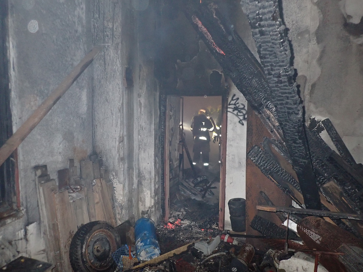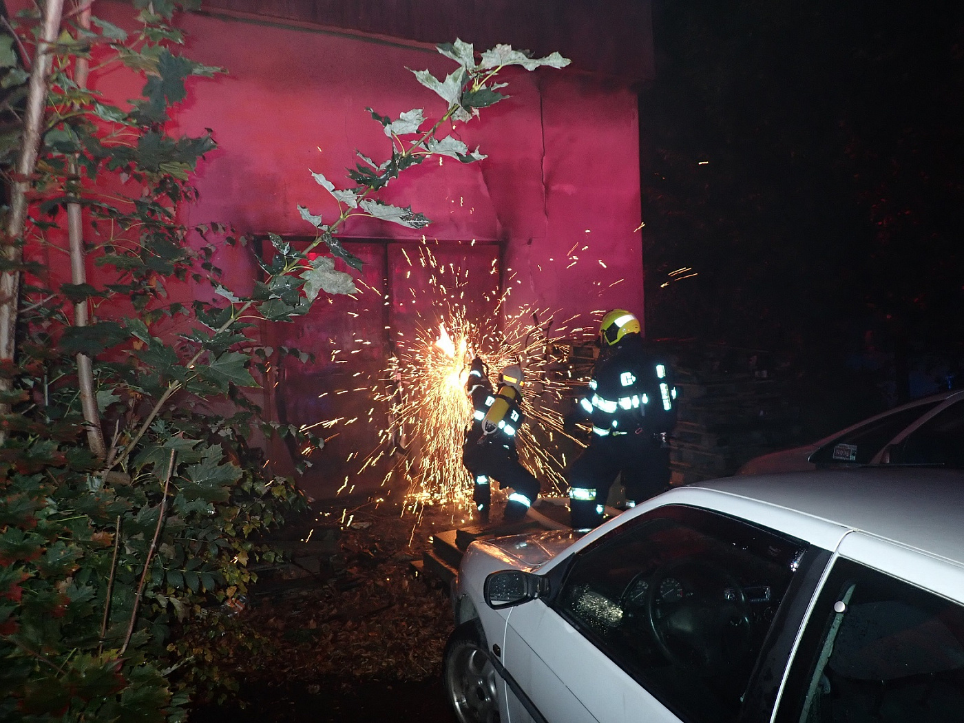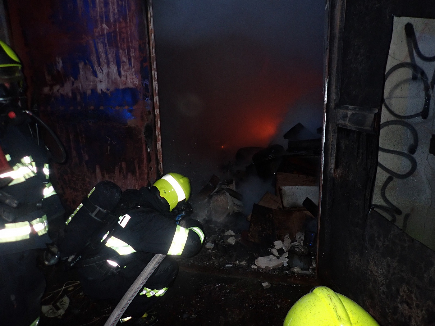 Průzkumem bylo zjištěno, že hoří uvnitř uzamčeného objektu bývalého pneuservisu na ulici Příční. Na uhašení požáru byly zřízeny dva útočné proudy vody C. Aby mohl být prováděn hasební zásah v budově, musel být v kovových vratech vyřezán otvor rozbrušovačkou. Hasiči v dýchacích přístrojích nalezli uvnitř čtyři tlakové láhve na plyn.