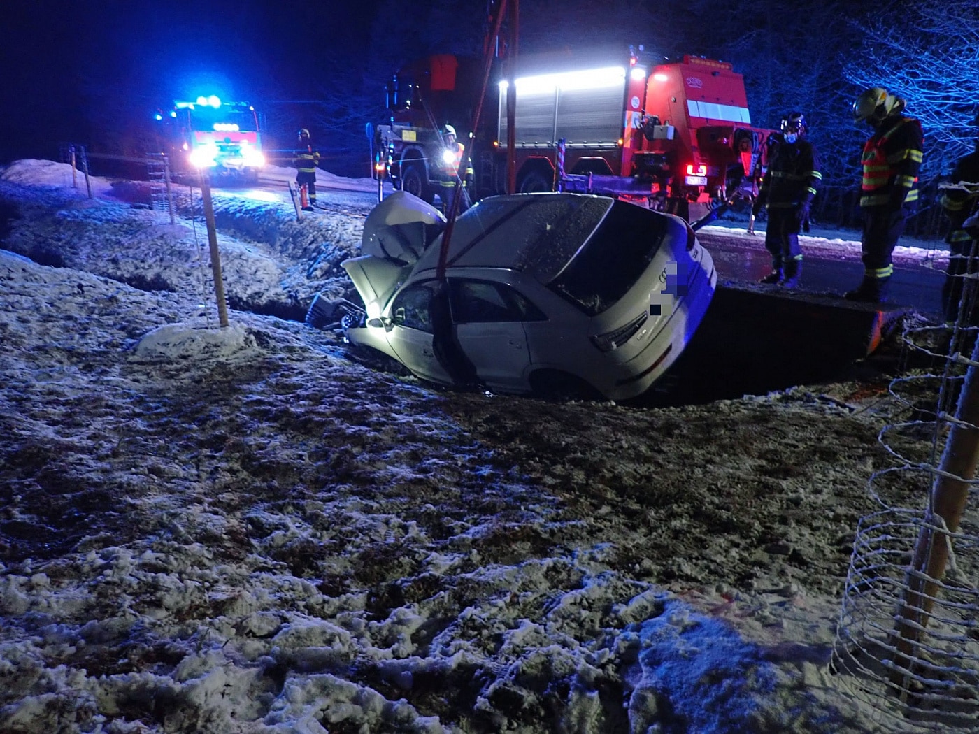 U Velkých Karlovic zasahovali hasiči u nehody osobního vozidla, bylo v příkopu na boku