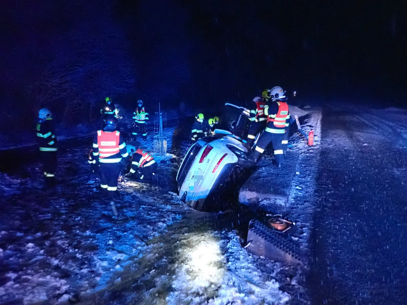 U Velkých Karlovic zasahovali hasiči u nehody osobního vozidla, bylo v příkopu na boku