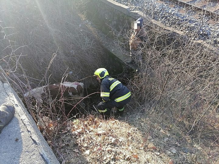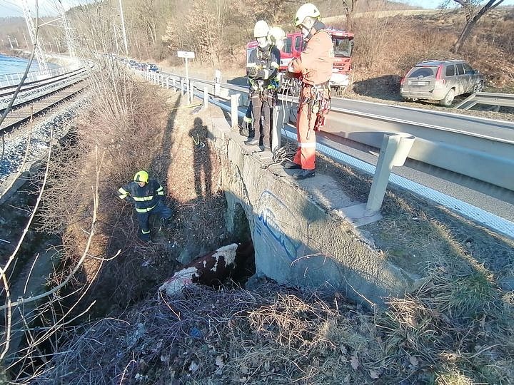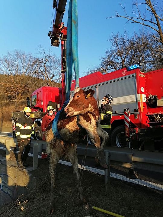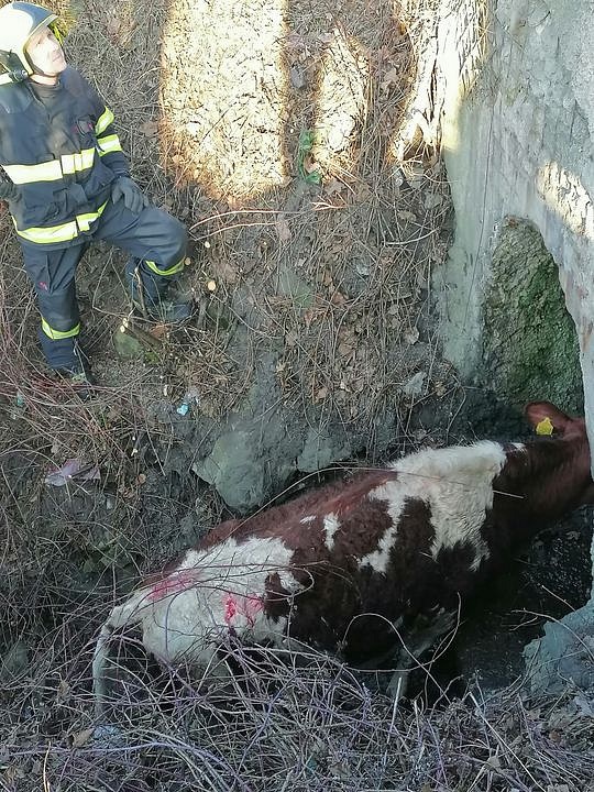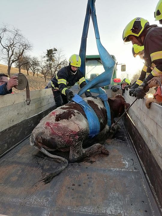 Netradiční záchranu prováděli hasiči ze stanic Valašské Meziříčí a Vsetín, kteří byli přivoláni k vyproštění uvízlého telete u obce Jablůnka na Vsetínsku.
