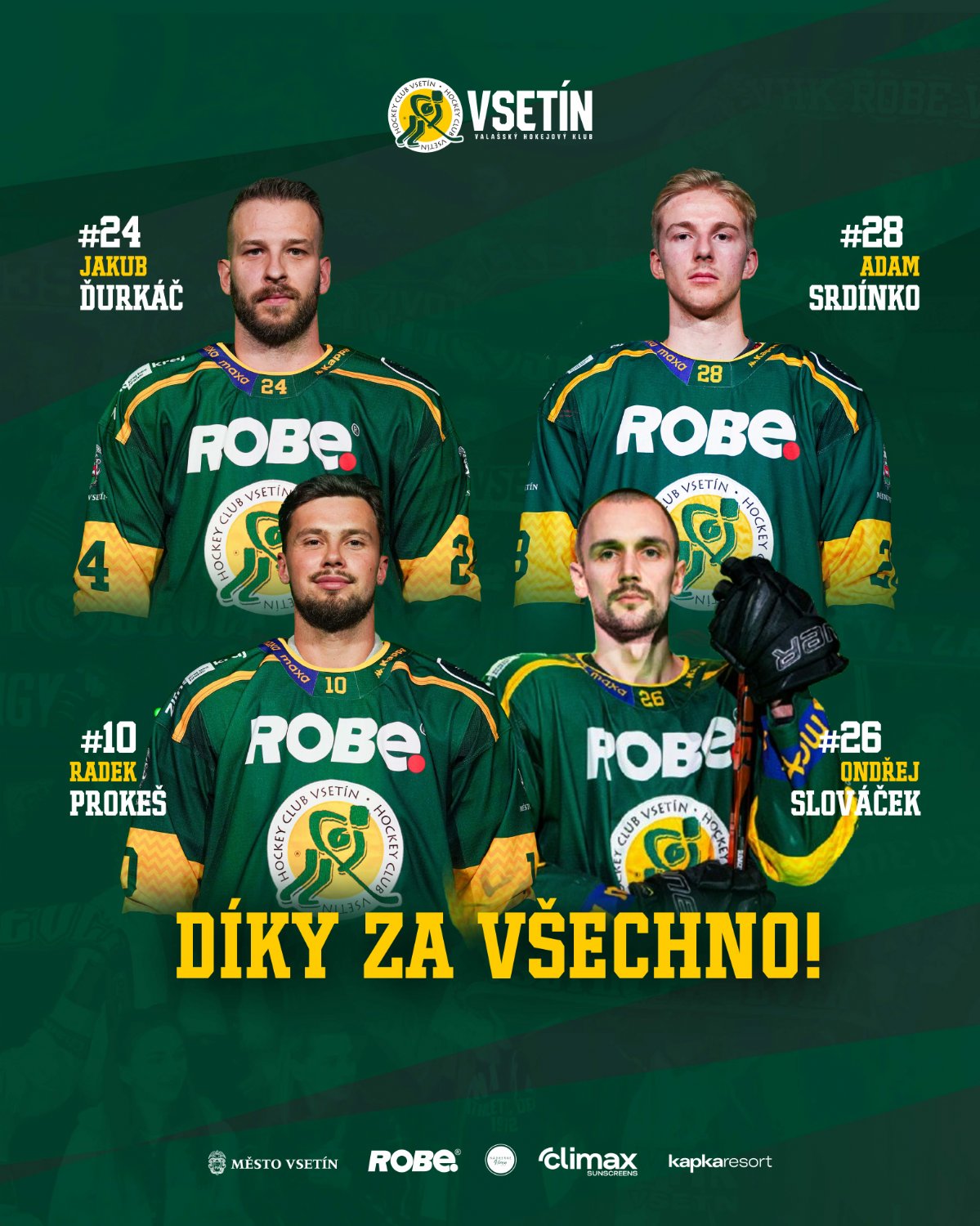 Adam Srdínko, syn legendárního Jana Srdínka, se loučí po náročné sezoně, během níž ho limitovaly zranění a nemoc. Kubovi Ďurkáčovi končí smlouva a klub se rozhodl stavět obranu více bruslivou a ofenzivní, což ovlivnilo jeho odchod. Útočník Radek Prokeš po dvou letech Valašsko opouští; klub hledá rychlejší typ centra pro nadcházející sezony.
