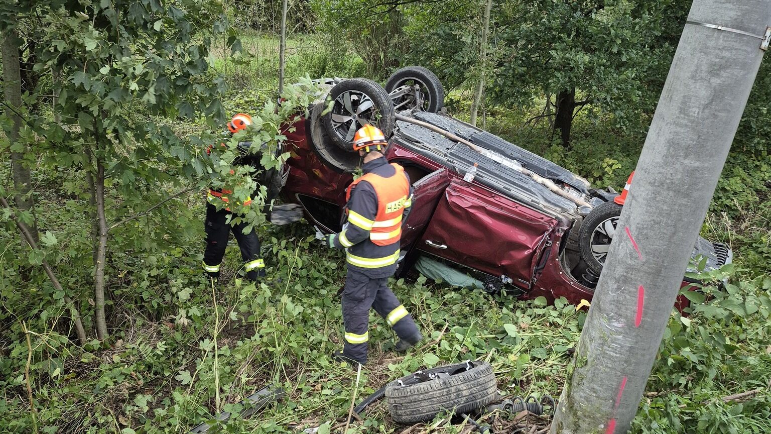První zásah zaznamenali hasiči krátce po 15. hodině u Jarcové mezi Valašským Meziříčím a Vsetínem. Osobní automobil havaroval mimo komunikaci, narazil do sloupu elektrického vedení a převrátil se na střechu. Na místo okamžitě vyjela jednotka z centrální stanice Valašské Meziříčí. Hasiči zajistili vůz proti vzniku požáru a provedli nezbytná bezpečnostní opatření. Zraněného řidiče si převzala posádka zdravotnické záchranné služby, hasiči následně uklidili komunikaci a předali místo Policii ČR.