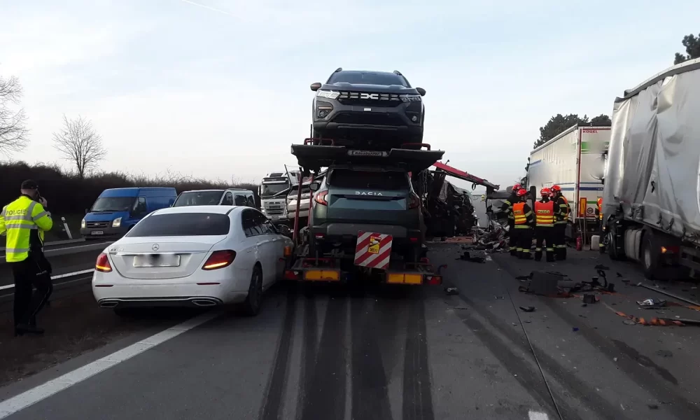 Dálnici D2 před Brnem v úterý odpoledne zablokovala vážná nehoda. Srazila se čtyři vozidla, včetně kamionu převážejícího nové vozy Dacia. Několik aut z něj spadlo a...